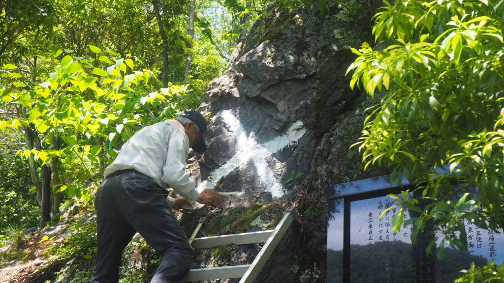 偶然にも、私たちが訪れた日は、5年ぶりのペンキの上書き作業が行われており、山を管理されている方から直接お話を伺える貴重な時間にも恵まれました。