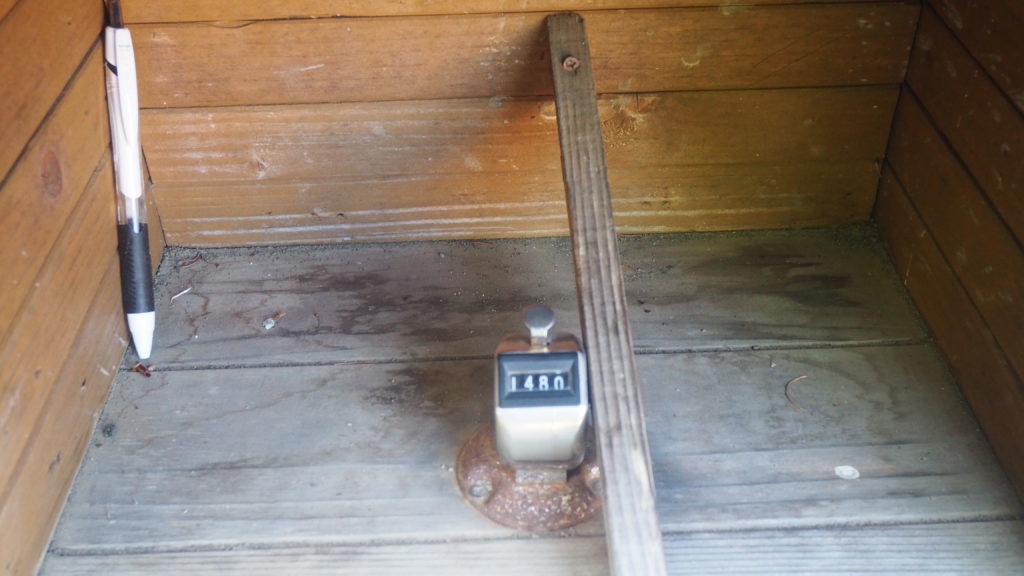 登山口には手作りの杖と入山者カウンターが設置されていました。